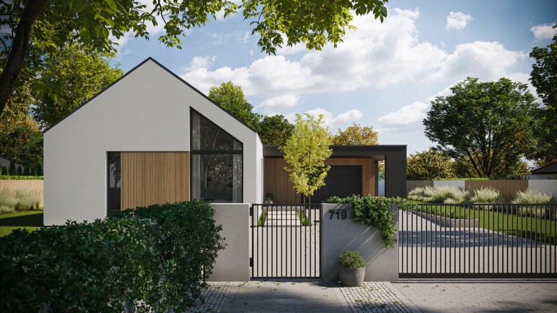 Гараж на одно авто и котельная с функцией кладовой запроектированы под плоскую кровлю. Основной жилой блок с двухскатной кровлей. Две детские, ванная и мастер-спальня с гардеробной расположены вдали от просторной кухни-гостиной, которую освещается высокий витраж со вторым светом.