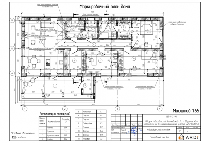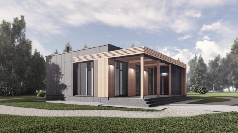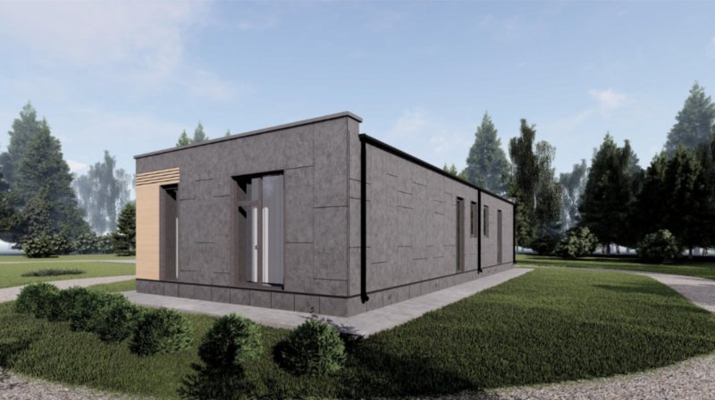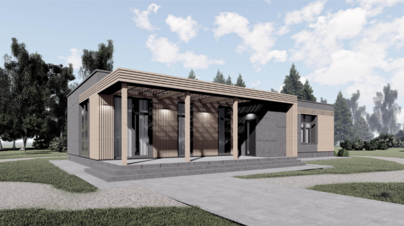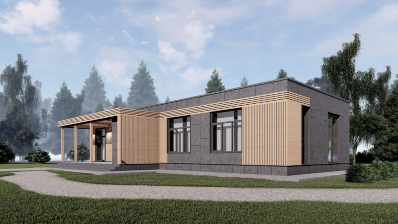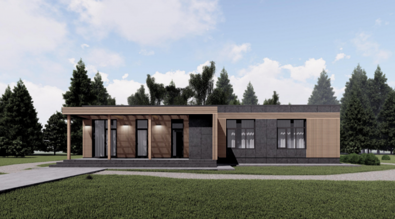 Здание представляет собой одноэтажный жилой дом. В доме запроектированы прихожая, кухня-гостинная, котельная, два санузла, спальня, две детских комнаты, и терраса. Кровля дома - плоская, не эксплуатируемая. Фундамент буронабивные сваи с ростверком.