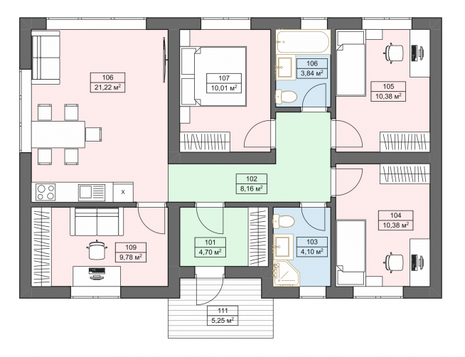 Имеет три спальни, один кабинет, кухню гостиную с выходом на задний двор, второй санузел.
