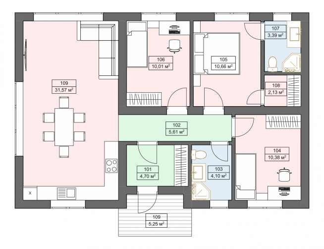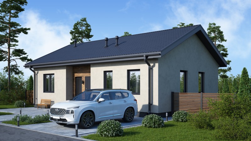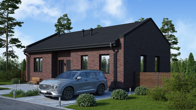 Компактный функциональный одноэтажный дом с классическим комбинированным фасадом и надежной двухскатной кровлей.