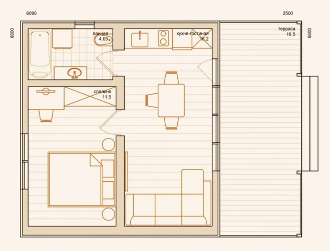 Уютный и компактный одноэтажный модульный дом для проживания семьи из двух человек. Кухня-гостиная площадью 16,2 м2 открывает возможности для приятного времяпровождения в кругу друзей. А в спальне площадью 11,5 м2 можно уединиться для комфортного отдыха в конце трудового дня.