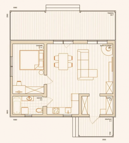 Дом для семьи из трех человек с просторной открытой террасой (22,7 м2). На входе в здание предусмотрен небольшой тамбур, где удобно хранить верхнюю одежду и уличную обувь.