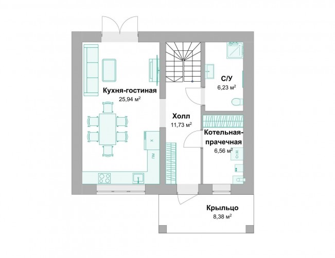 Проект рассчитан на семью из 3-5 человек. Первый этаж занимает просторная кухня-гостиная с выходом во внутренний двор. В большой котельной помимо отопительного оборудования легко разместится удобная прачечная для хозяйки. Два полноценных санузла и три спальни в этом доме позволят с комфортом жить в нём любой семье.