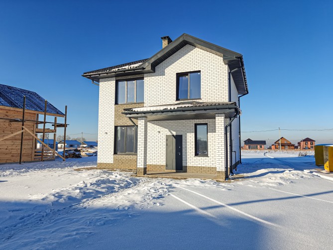 Двухэтажный коттедж в современном стиле с фасадом из облицовочного кирпича. Правильной формы небольшой дом легко вписывается в любой ландшафт и в земельные участки произвольного размера. Особенность дома — большие окна, которые пропускают много света и делают пространство внутри более светлым и воздушным.