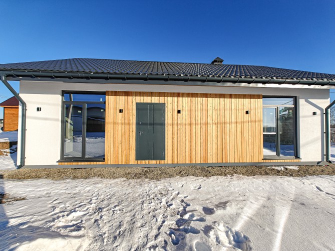 Лаконичный, экономичный дом обладает внутренней простотой. Планировкой предусмотрены просторная кухня-гостиная, три спальни, санузел и котельная. Комнаты квадратной формы позволяют наиболее эффективно использовать внутреннее пространство. Большие панорамные окна обеспечивают поток естественного света и красивый вид на окружающую природу. Этот дом — уютное и функциональное решение для тех, кто ценит практичность и простоту в деталях.