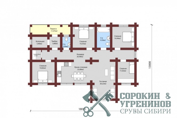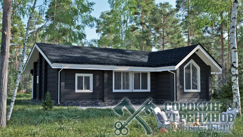 Индивидуальный проект жилого дома из лафета сечением 300х450мм, площадь дома 166м2. Размер сруба 13х18 метров. Одноэтажный дом небольшого размера выполнен из мощного большого лафета кедра, теплый и красивый, в стиле Европейского Шале. Планировка дома: три комнаты, большая гостиная совмещена с кухней, прихожая, котельная и два санузла, есть небольшая веранда. Дом был установлен в Челябинске в 2015 году.