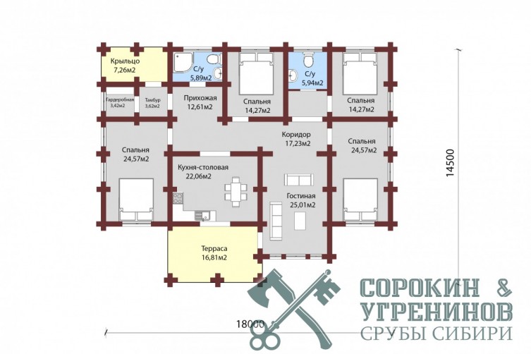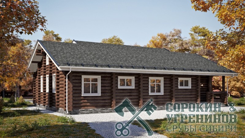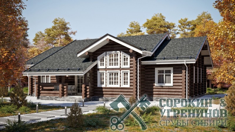 Проект дома из бревна диаметром 300мм, размер сруба по осям 14,5х18м, общая площадь дома 197м2, объём бревна в срубе 190м3. Большой одноэтажный дом со вторым светом, имеет четыре спальные комнаты, два санузла, гостиная, кухня, крыльцо, тамбур, гардеробная, терраса. Дом смотрится как двухэтажный из-за высоких потолков и второго света.