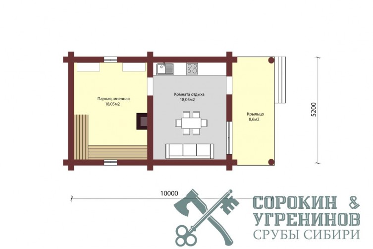 Сруб бани рубленый из бревна кедра большого диаметра 280мм, площадью 41,4м2. Размер сруба 5,2х10 метров по осям. Простая планировка бани, парная и душевая совмещены, комната отдыха, терраса. Сруб рубленый вручную в русскую чашу (охлоп), бревна окоренные гидро-окоркой (водой под высоким давлением), а так, же это можно сделать скобелем или лопатой, или строганное рубанком. Объем бревна в срубе 42,9м3.