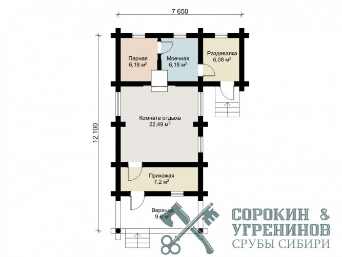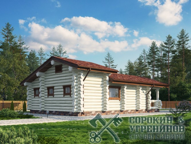 Сруб бани рубленый из бревна кедра диаметра 280мм площадью 57,3м2. Размер сруба 7,6х12,1 метров по осям. Планировка бани, парная и душевая раздельные, раздевалка и отдельный вход в баню. Прихожая, комната отдыха с кухней, веранда. Сруб рубленый вручную в русскую чашу (охлоп), брёвна окоренные гидро-окоркой (водой под высоким давлением), а так, же это можно сделать скобелем или лопатой, или строганное рубанком. Объем бревна в срубе 60м3.