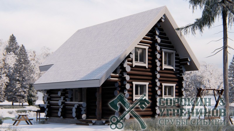 Проект дом-баня из бревна диаметром 320мм, площадь дома 80м2. Размер сруба 8х8 метров. На первом этаже баня, парная и мойка, и гостиная совмещенная с кухней, лестница на второй этаж, две спальные комнаты и небольшой холл. Проект планировался как временное жилье пока строится основной большой дом. Дом-баня установлен в 2010 году, в Новосибирской области в поселке Кудряшовский в живописном месте среди больших сосновых деревьев, на склоне с выходом к берегу реки Обь.