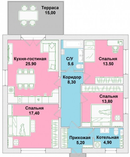 Для обеспечения лучшей шумоизоляции и приватности, кухня – гостиная (26 кв. м.) изолирована от спальных комнат (17, 14, 14 кв. м.) и пришедшие гости не помешают членам семьи захотевшим отдохнуть.